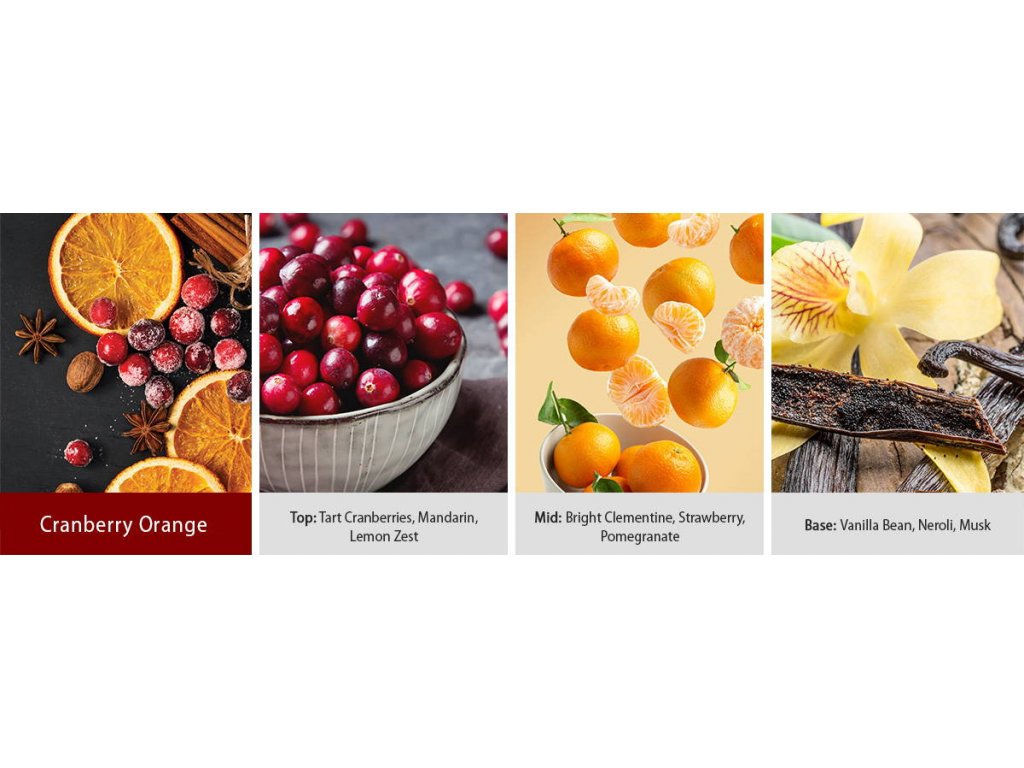 Vůně Cranberry Orange od Country Candle je ovocná a sladká. Vůně čerstvých, kyselých brusinek a mandarinek je dokonale doplněna tóny citronové kůry. Nuance klementinek, jahod a granátových jablek dodávají vonné svíčce Cranberry Orange její hloubku. Vanilka, neroli a pižmo poskytují příjemné teplo.